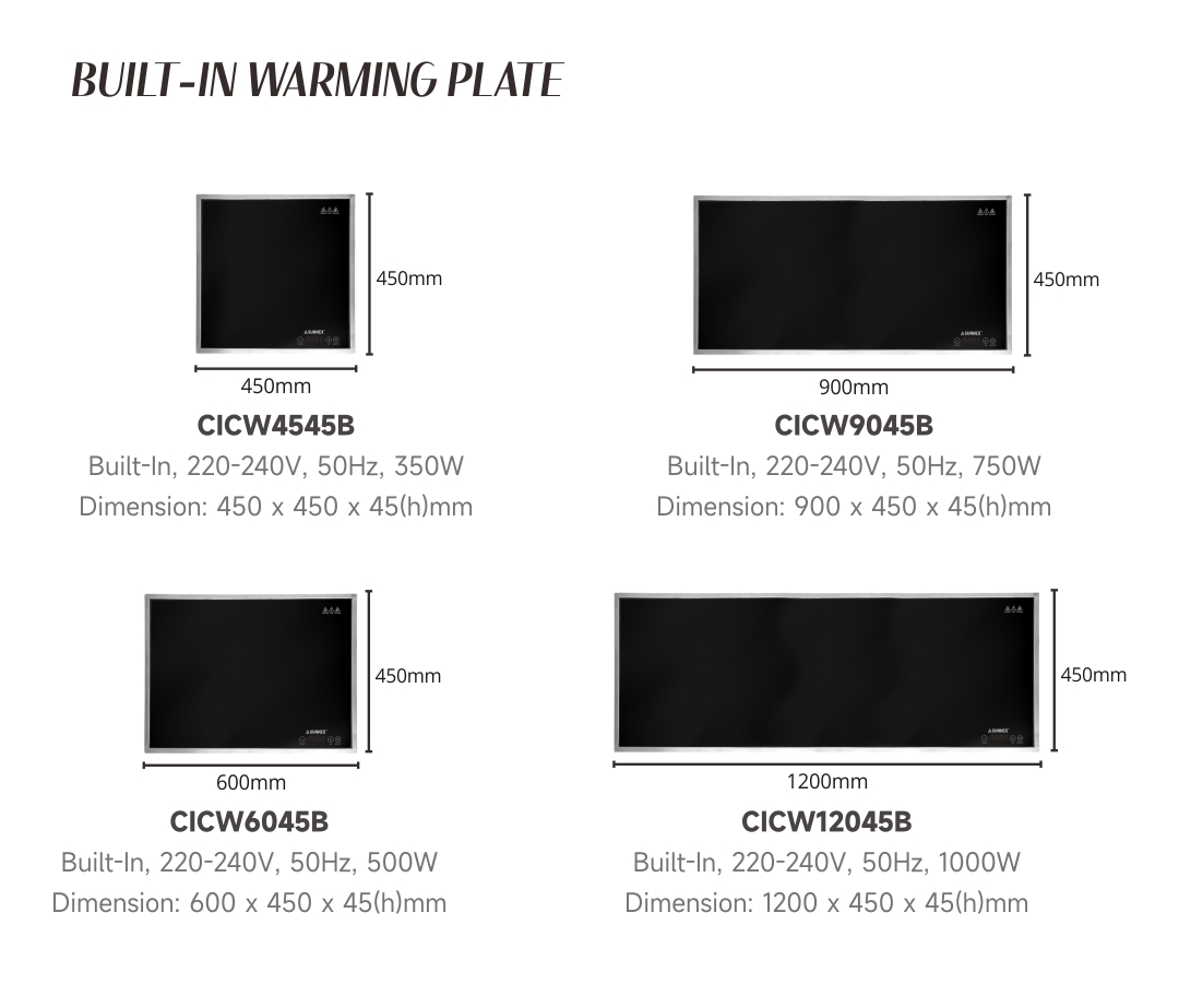 • Dimensi mulai dari 350 × 300 mm hingga 1200 × 450 mm agar sesuai dengan garis prasmanan atau jendela tembus apa pun